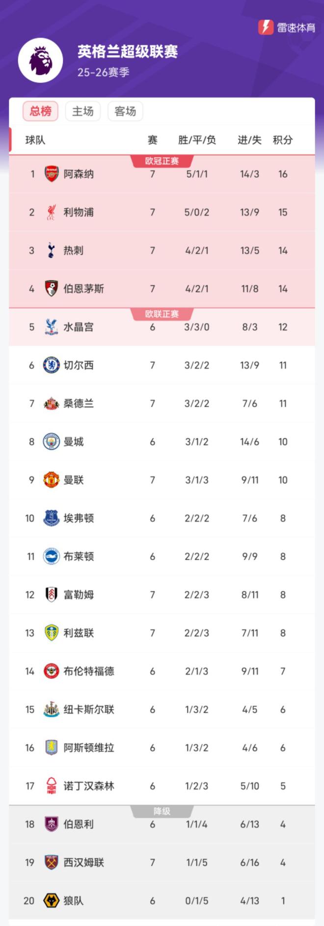 雷速体育10月5日讯 随着英超今日比赛的结束,英超的榜首也发生了更迭。利物浦遭遇连败后跌落第二,而阿森纳反超登上了头把交椅。