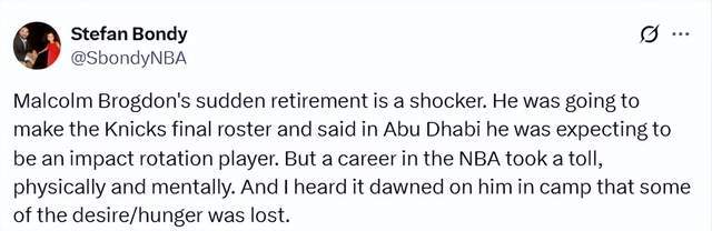 上周尼克斯队训练结束后,布罗格登曾谈到外界对运动员的看法:“我觉得那些没经历过职业体育的人,总会对顶尖运动员指手画脚,但他们根本不懂这份职业的艰辛。他们不会明白,多年维持顶级竞技水平,身体会承受怎样的负荷;也不会理解这项运动对身体的损耗有多大。”“但当你选择成为职业球员、签下合同时,就注定要面对外界的各种声音。作为球员,你只能屏蔽这些干扰,因为这些评价无关紧要。你要做的就是努力保持健康,一旦健康,就全力发挥统治比赛。”尼克斯队记Bondy表示:“NBA生涯的消耗实在太大,无论是身体还是精神层面,我听说布罗格登在训练营中突然意识到自己失去部分渴望与斗志。”