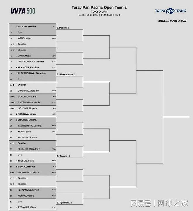 东京站:鲍里妮、莱巴金娜领衔,中国金花王欣瑜首轮对阵一位资格赛球员。