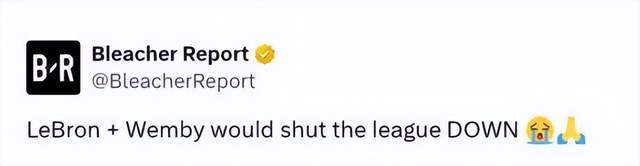 10月28日,在湖人落败开拓者之后,知名美媒Bleacher Report更新社交账号,发文写道:“詹姆斯和文班亚马这对组合能直接统治联盟啊!马刺应该寻求交易詹姆斯,让这两位状元联手。”虽然只是一则媒体的预想消息,但足以引起球迷圈热议。主要还是在于文班亚马本赛季的开局实在是太疯狂了。