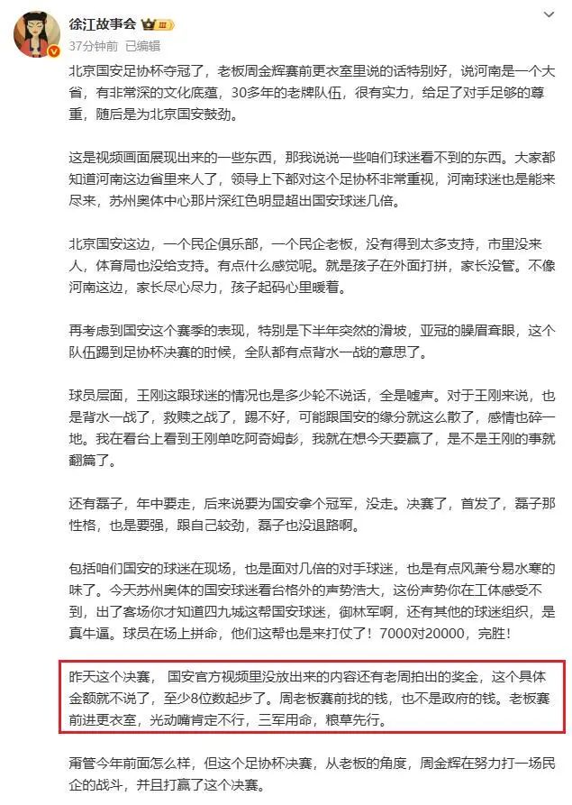 赛前,就有媒体披露河南队开出了500万赢球奖。不过,媒体人徐江在个人社交账号上发文谈及了国安这场足协杯决赛的奖金,其表示俱乐部老板周金辉拍出的奖金金额至少8位数起步,这是周老板赛前找的钱。如果徐江爆料属实的话,这意味着国安的足协杯赢球奖高达千万以上,远超河南队的500万,难怪足协杯决赛国安气势如虹,原来是重赏之下必有勇夫。